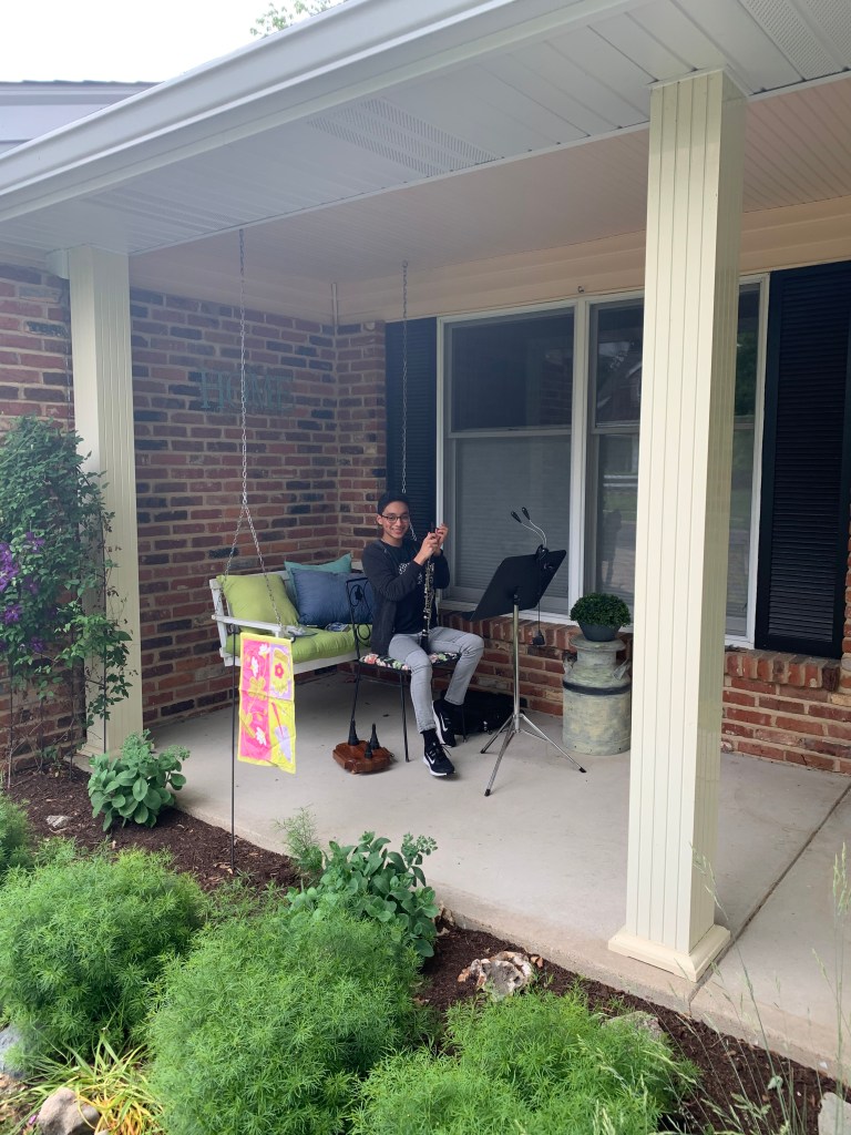 So I began to think about safe ways I could bring my local students back into my studio. Put up plastic sheeting? Open the windows? Fans/no fans? Air purifier? (I could find no residential air purifier that filters viruses). Nothing seemed safe enough, until I thought about our porch. It’s not huge but unless it’s pouring down rain, might I be able to continue lessons safely outside on our porch for a few months? I asked a nurse friend and studied CDC guidelines for distancing outside to come up with a plan.
